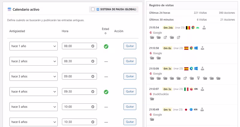 El plugin no solo envía a Bluesky y Mastodon los post nuevos cuando se publican, también permite crear una programación para refrescar tus entradas antiguas y publicar a la hora que te parezca los post de ese mismo día, pero de otros años. Se puede usar para publicar efemérides o darle un poco de aire a tus contenidos antiguos. Lo puedes ver funcionando en esta cuenta de Bluesky @jrmora-hemeroteca.bsky.social y por aquí tienes la nota inicial de la función con los detalles.