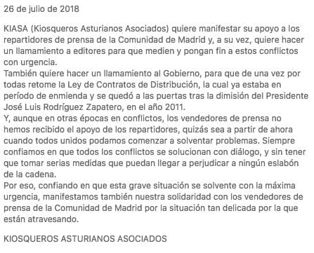 Olvidan la reacción de los repartidores para perjudicar lo mínimo a los vendedores de prensa y también olvidan reseñar que los repartidores están recibiendo apoyos de algunas asociaciones de quiosqueros.